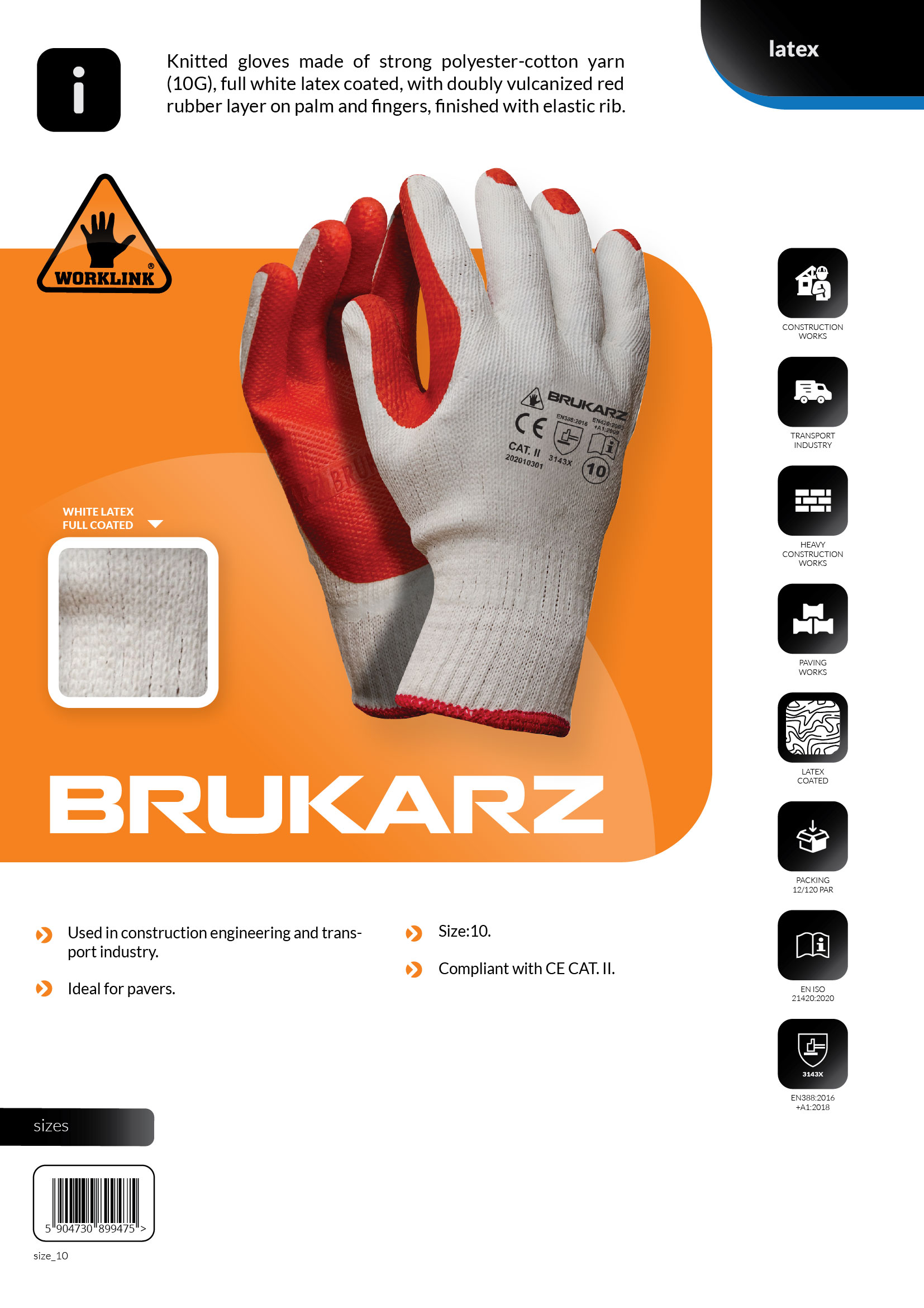 Rękawice wykonane z dzianiny bawełnianej z domieszką poliestru (ścieg 10; 90% bawełna, 10% poliester). W całości powlekane białym lateksem, dłoń oblana grubą warstwą podwójnie wulkanizowanej gumy.