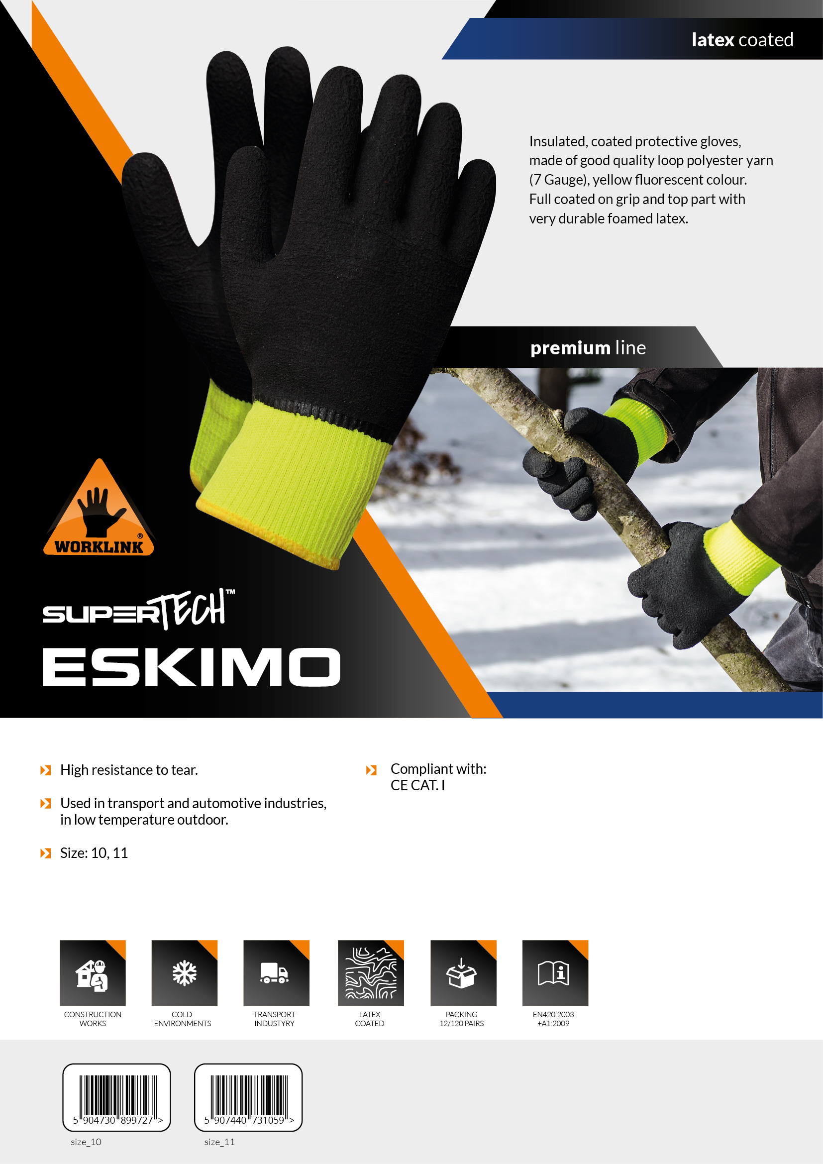 Rękawice robocze wykonane z pętelkowej dzianiny poliestrowej (ścieg 7), w kolorze fluorescencyjnym, powlekane na części chwytnej jak i wierzchniej, czarnym spienionym lateksem. Powleczenie zapewnia przyczepność oraz doskonałą chwytność.