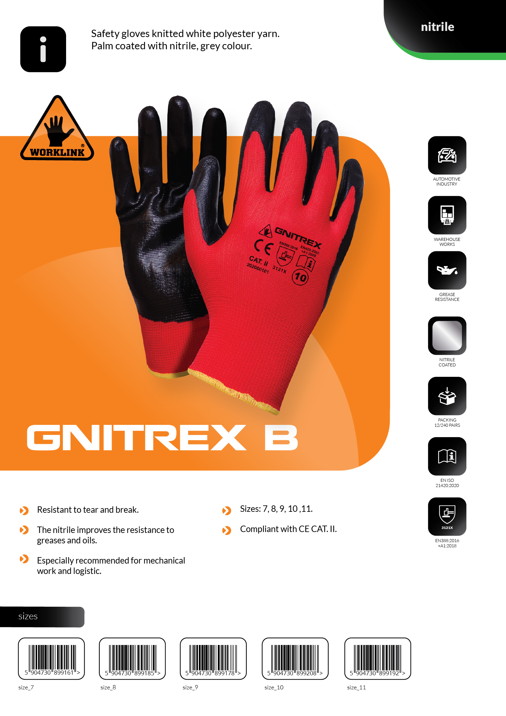 Rękawice ochronne wykonane z elastycznej dzianiny poliestrowej (ścieg 13; 100% poliester) w kolorze czerwonym, powlekane czarnym nitrylem.