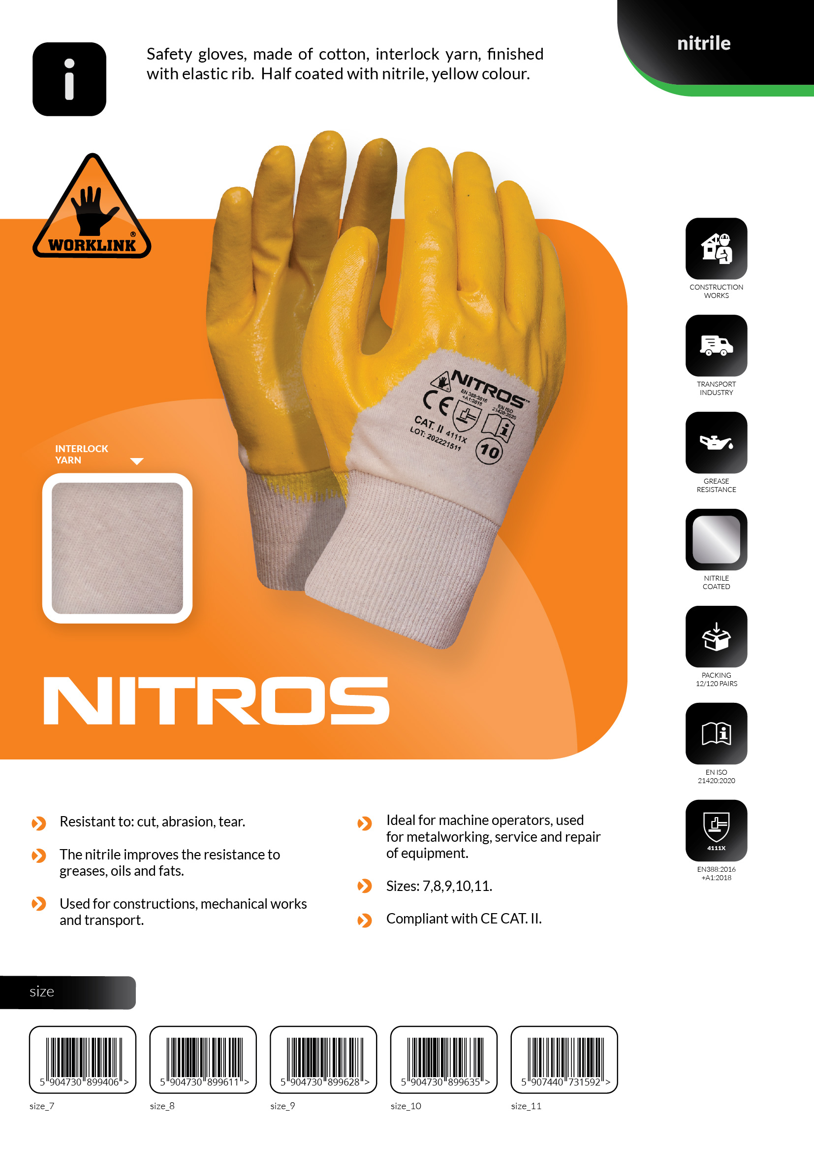 Rękawice głęboko powlekane żółtym nitrylem, do kości śródręcza, na bawełnianej dzianinie typu interlock, zakończone elastycznym ściągaczem.
