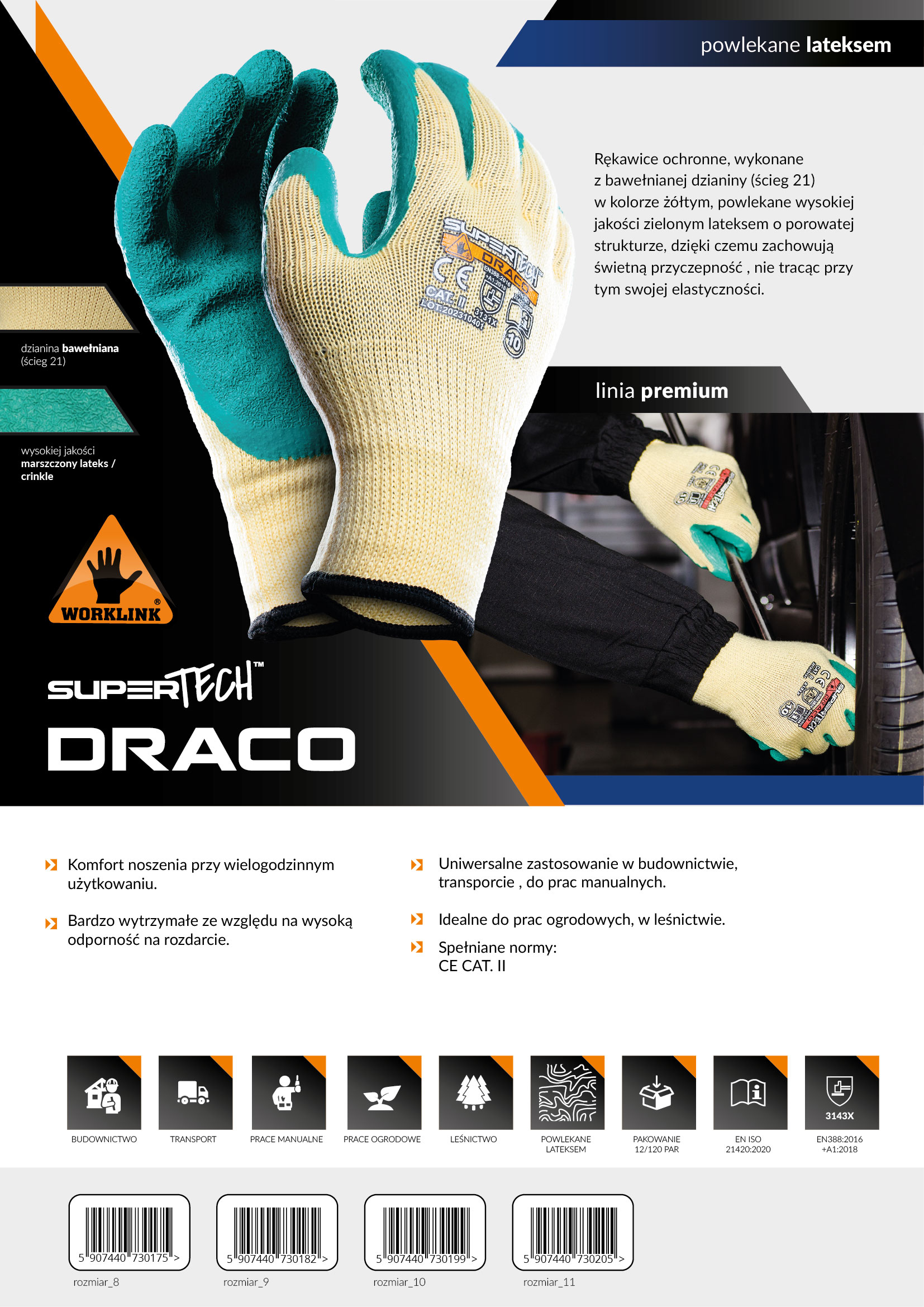 Rękawice ochronne wykonane z dzianiny (ścieg 21) w kolorze żółtym, powlekane wysokiej jakości zielonym lateksem o porowatej strukturze. Gwarantowany komfort noszenia ze względu na jakość bawełny, nawet przy wielogodzinnym użytkowaniu. Powleczenie lateksem o porowatej strukturze powoduje doskonałą przyczepność, nie tracąc na swojej elastyczności. Trudno ścieralne i bardzo wytrzymałe.