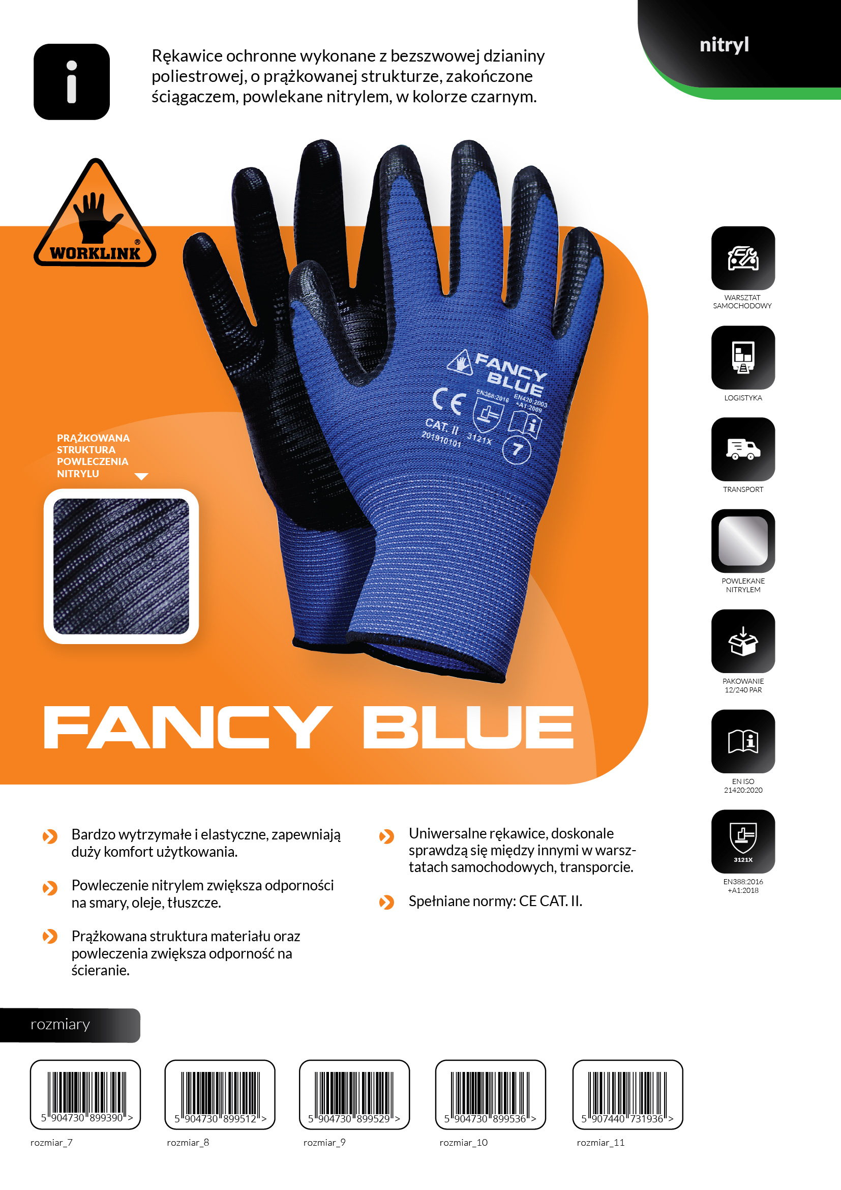 Rękawice wykonane z wytrzymałej dzianiny poliestrowej (ścieg 13; 100% poliester), zakończone ściągaczem, powlekane nitrylem o prążkowanej strukturze w kolorze czarnym.