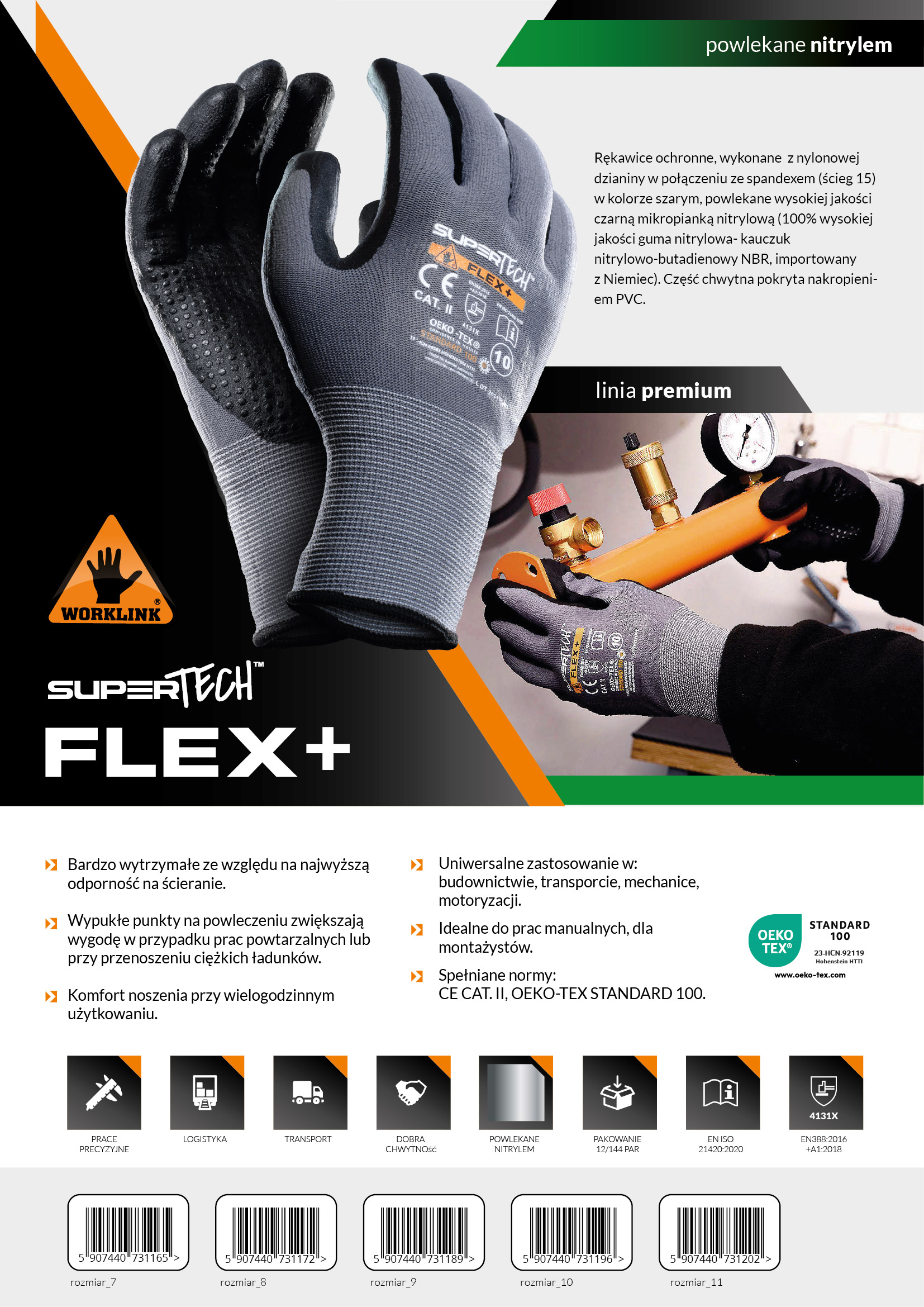 OEKO-TEX STANDARD 100. Rękawice ochronne, wykonane z nylonowej dzianiny w połączeniu ze spandexem (ścieg 15) w kolorze szarym, powlekane wysokiej jakości czarną mikropianką nitrylową, dłoń pokryta nakropieniem PVC. Jest to 100% wysokiej jakości guma nitrylowa importowana z Niemiec (kauczuk nitrylowo-butadienowy NBR).