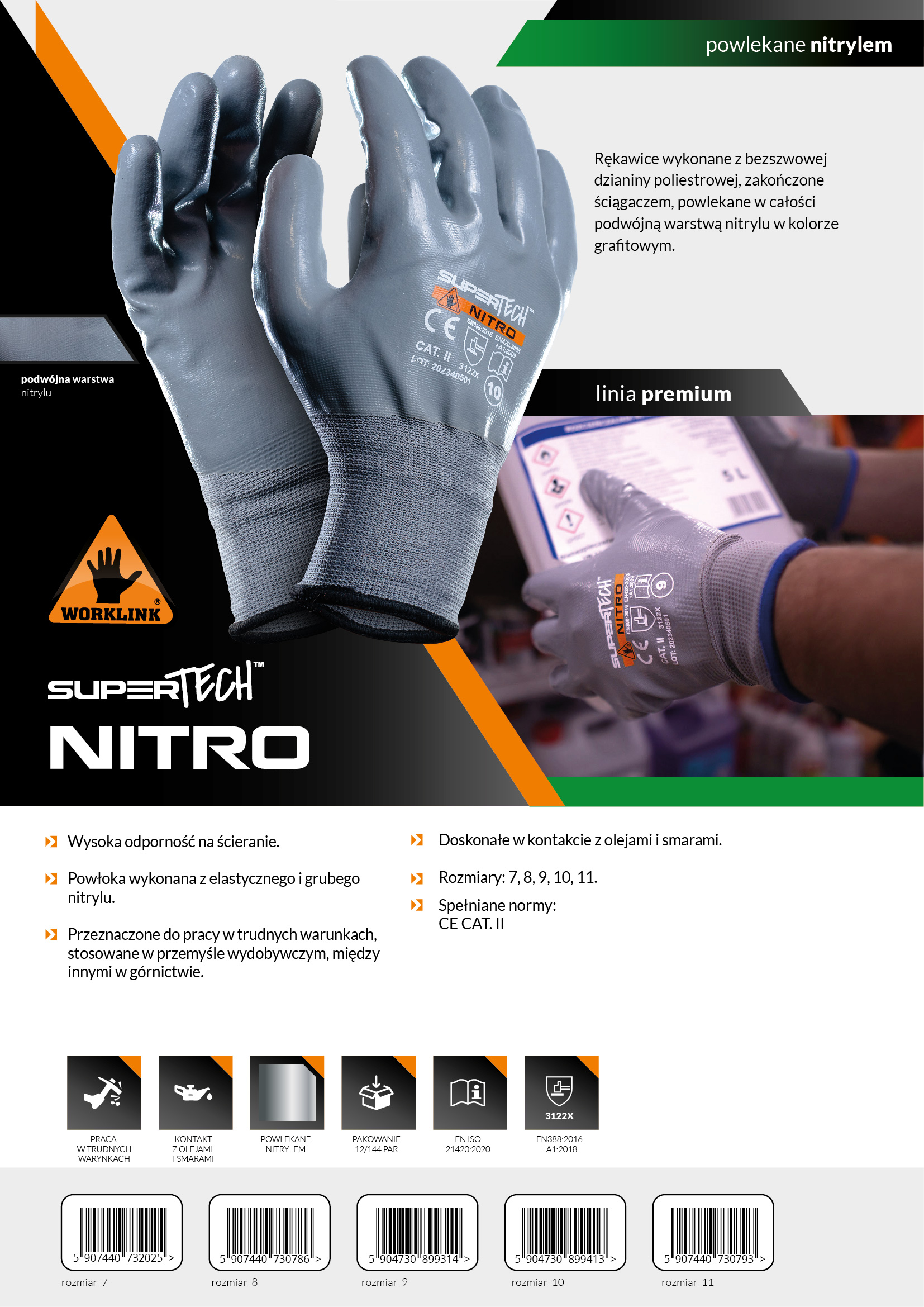Rękawice wykonane z bezszwowej dzianiny poliestrowej (ścieg 15; 100% poliester), zakończone ściągaczem, powlekane w całości podwójną warstwą nitrylu w kolorze grafitowym.