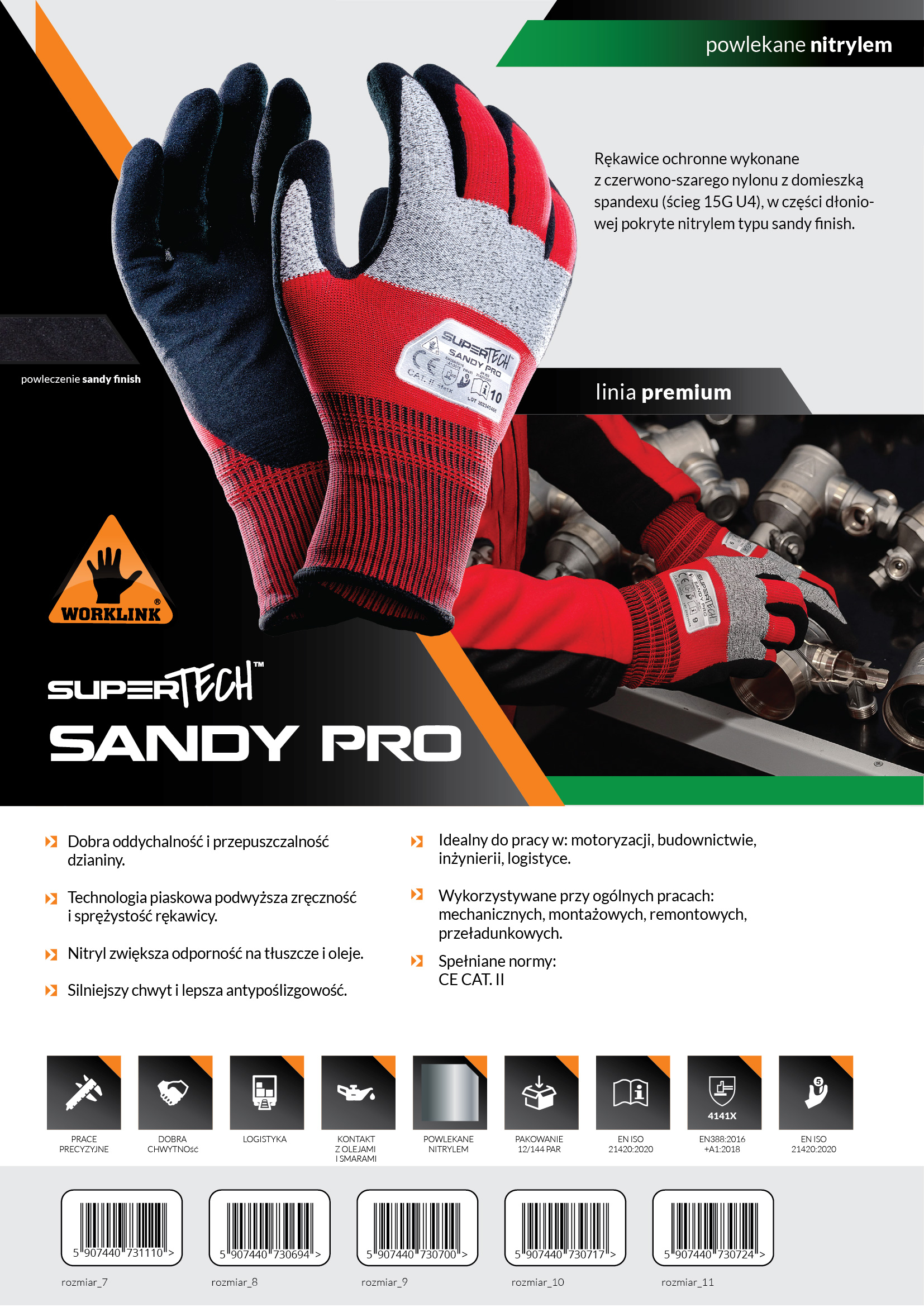 Rękawice ochronne wykonane z czerwono-szarego nylonu z domieszką spandexu (dzianina 15G), w części dłoniowej pokryte nitrylem typu sandy finish. Nitryl zwiększa odporność na tłuszcze i oleje, a technologia piaskowa zwiększa elastyczność i zręczność rękawicy.