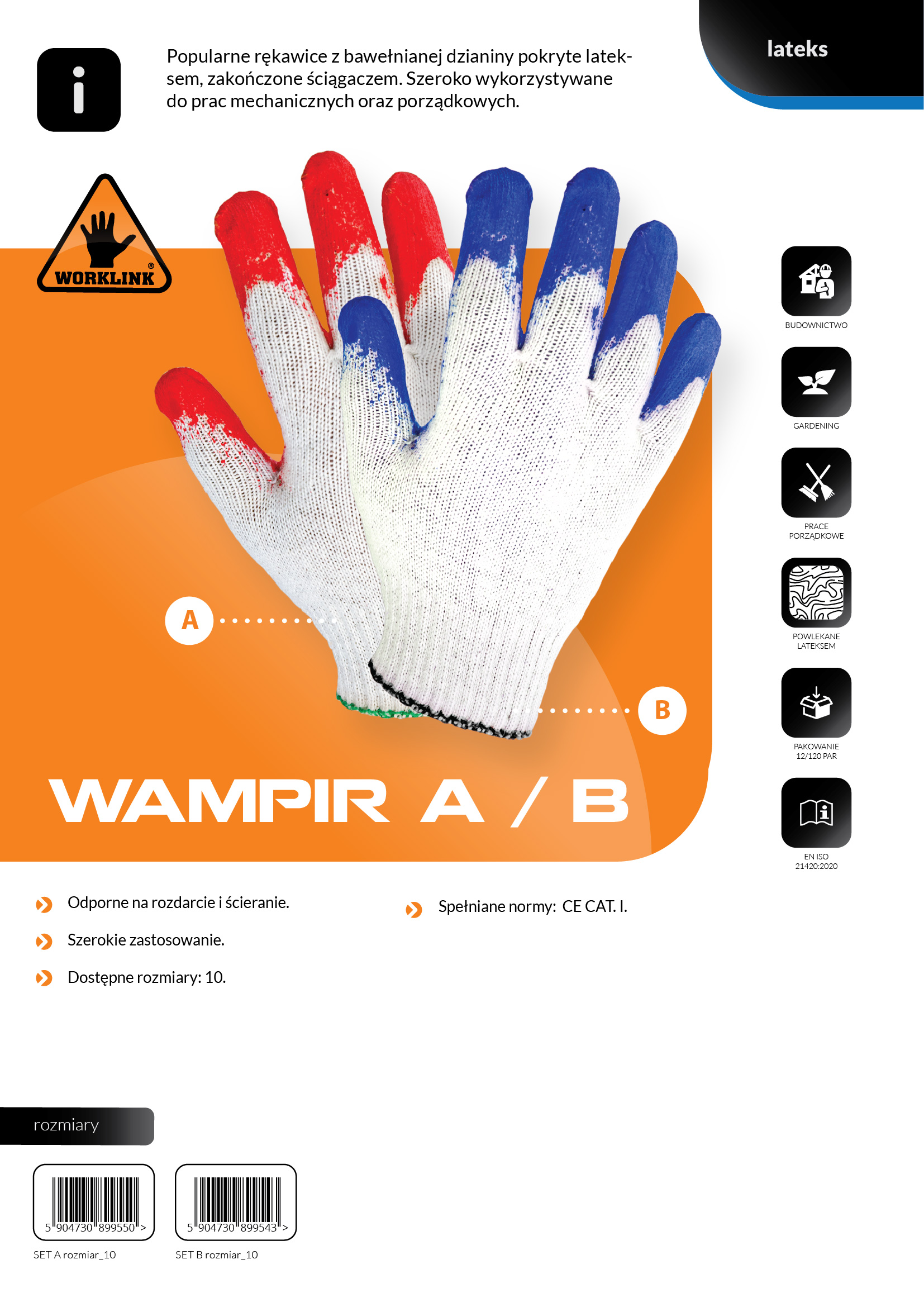 Popularny rodzaj rękawiczek dzianych powlekanych lateksem w kolorze czerwonym, wykończonych elastycznym ściągaczem.