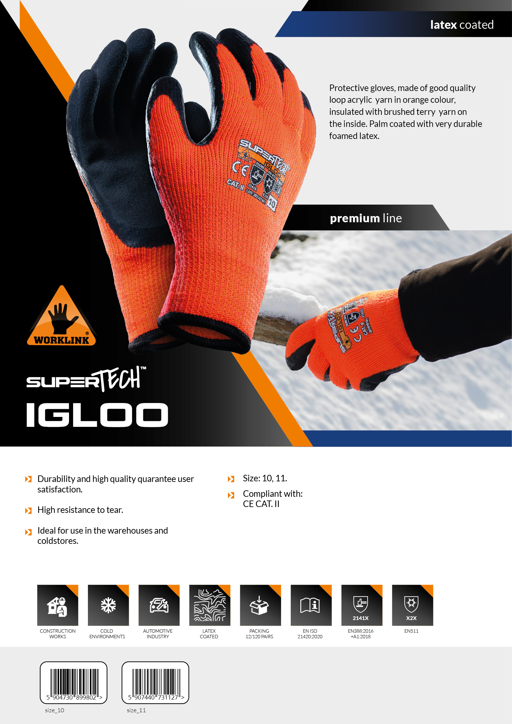 Rękawice ochronne, wykonane z pętelkowej dzianiny akrylowej ( ścieg 7), o wysokim współczynniku ciepłochronności w kolorze fluorescencyjnym, powlekane czarnym, spienionym lateksem, bardzo dobrze ocieplone.
