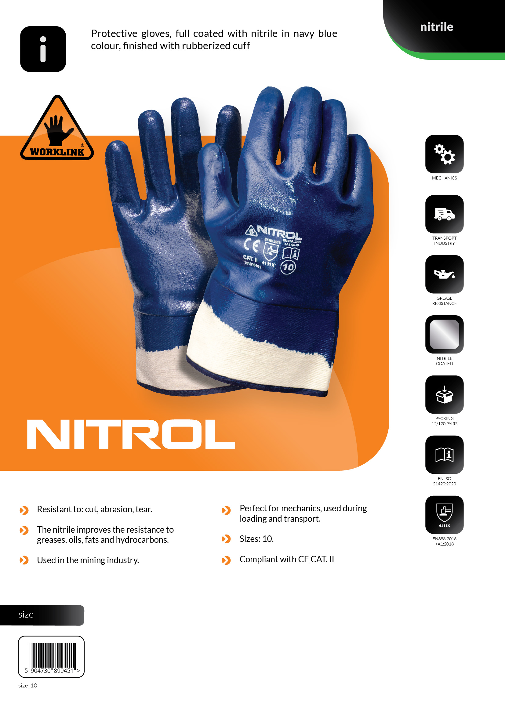 Rękawice ochronne wykonane z dzianiny typu jersey, w całości powlekane nitrylem w kolorze granatowym, zakończone usztywnianym mankietem.
