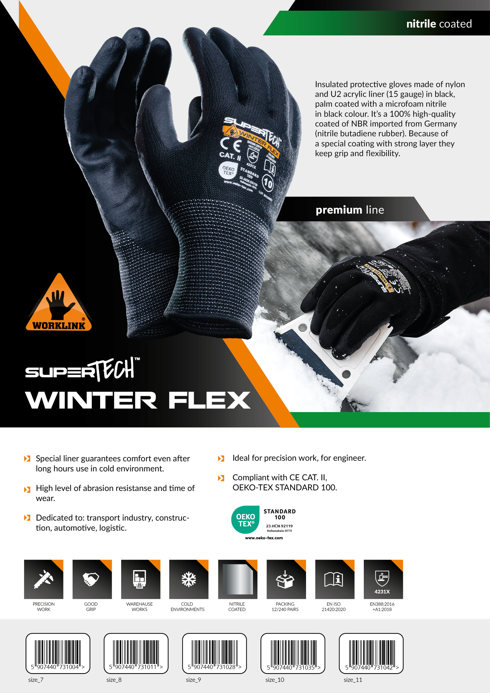 OEKO-TEX STANDARD 100. Ocieplane rękawice ochronne, wykonane z nylonowej dzianiny w połączeniu z akrylem (ścieg 15G U2) w kolorze czarnym, powlekane wysokiej jakości czarną mikropianką nitrylową, zakończone ściągaczem. Jest to 100% wysokiej jakości guma nitrylowa importowana z Niemiec (kauczuk nitrylowo-butadienowy NBR).
