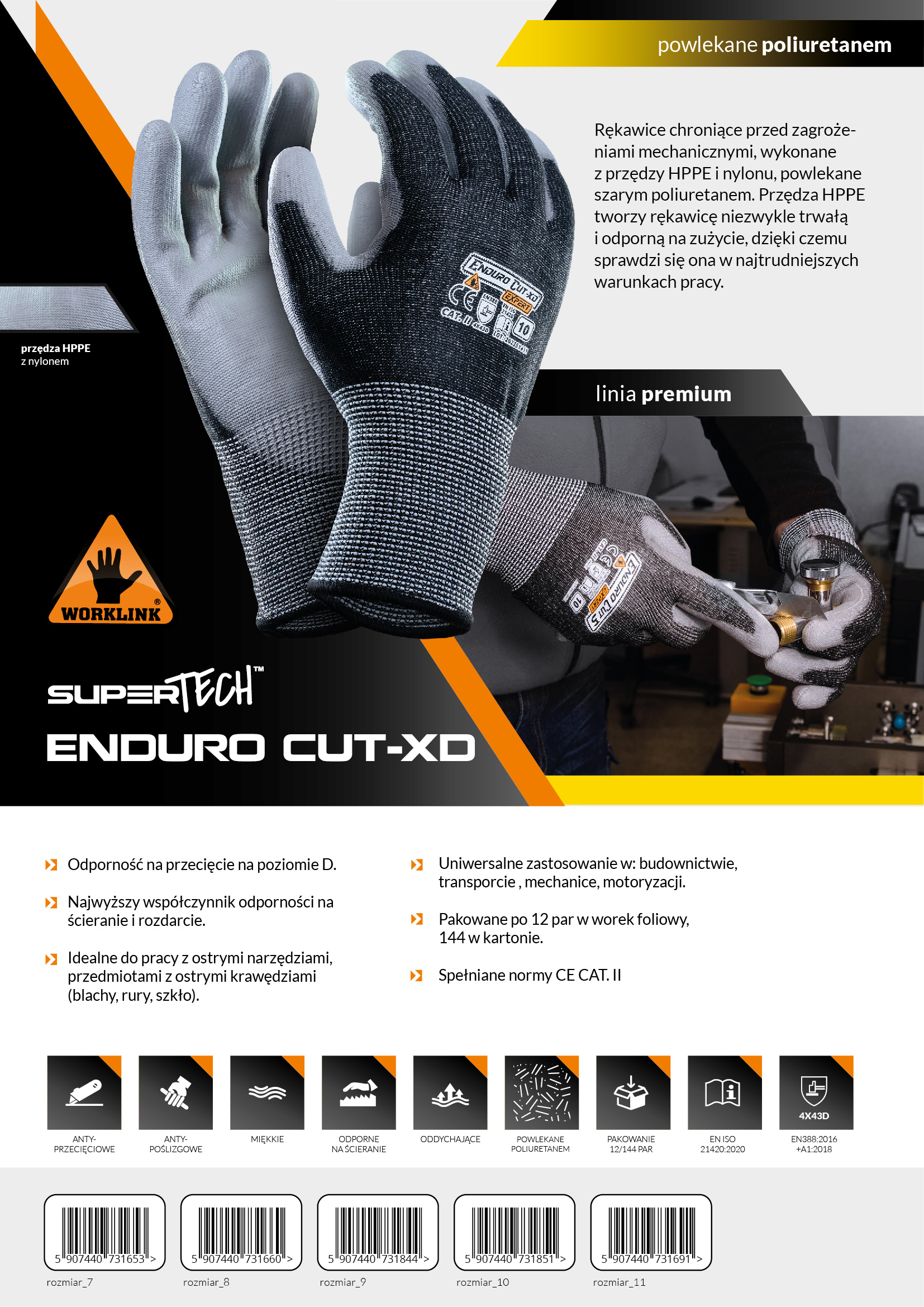 Rękawice chroniące przed zagrożeniami mechanicznymi, wykonane z dzianiny nylonowej w połączeniu ze spandexem z dodatkowym włóknem szklanym (przędza HPPE, ścieg 13 U2), powlekane szarym poliuretanem. Przędza HPPE tworzy rękawicę niezwykle trwałą i odporną na zużycie, dzięki czemu sprawdzi się ona w najtrudniejszych warunkach pracy.