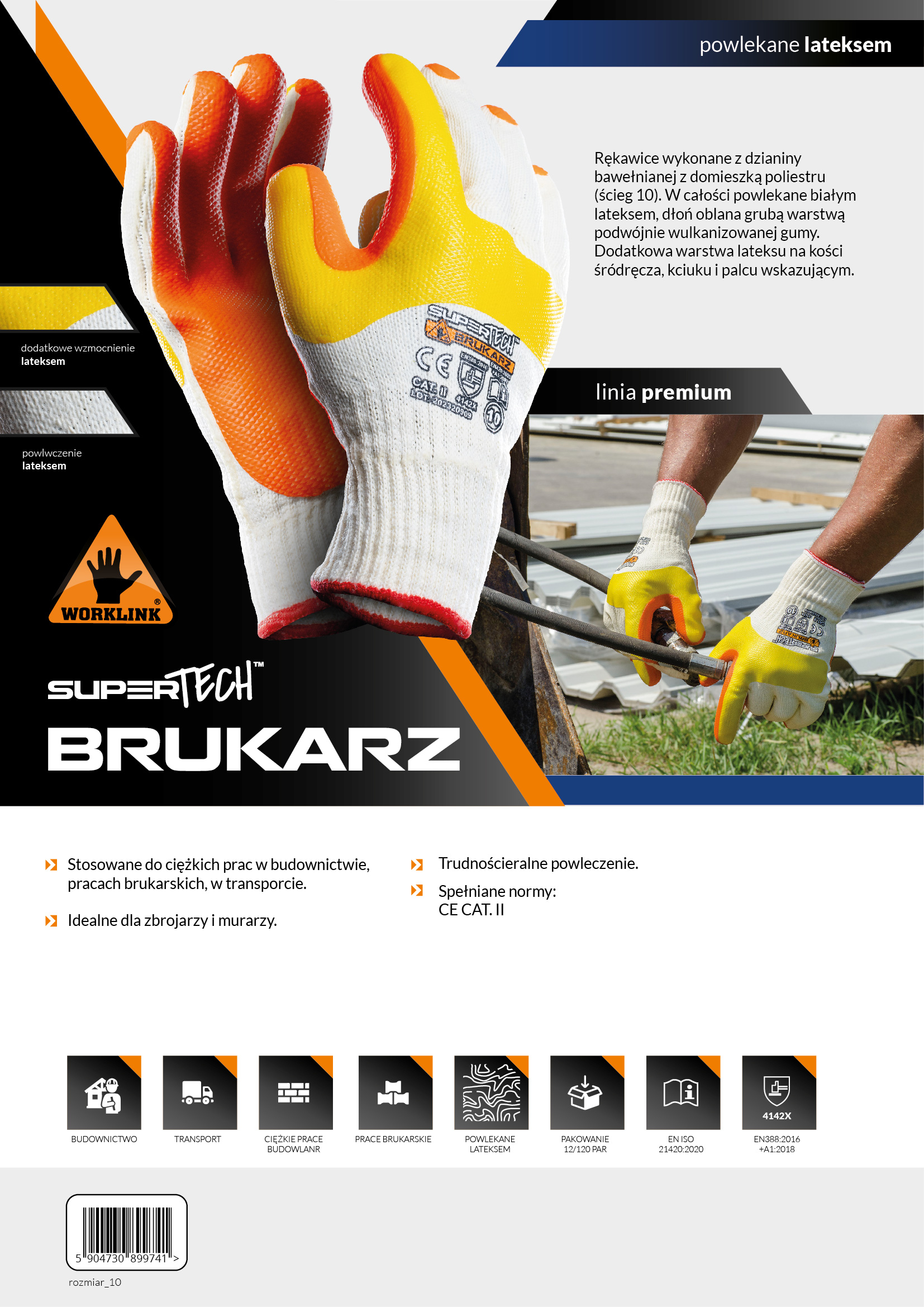 Rękawice ochronne wykonane z dzianiny (ścieg 10) w kolorze czarnym, powlekane czarnym lateksem o porowatej strukturze. Bawełniana dzianina gwarantuje komfort noszenia nawet przy wielogodzinnym użytkowaniu. Powleczenie lateksem o porowatej strukturze, powoduje doskonałą przyczepność, nie tracąc na swojej elastyczności. Trudno ścieralne i odporne na zużycie. Doskonała relacja ceny do jakości!