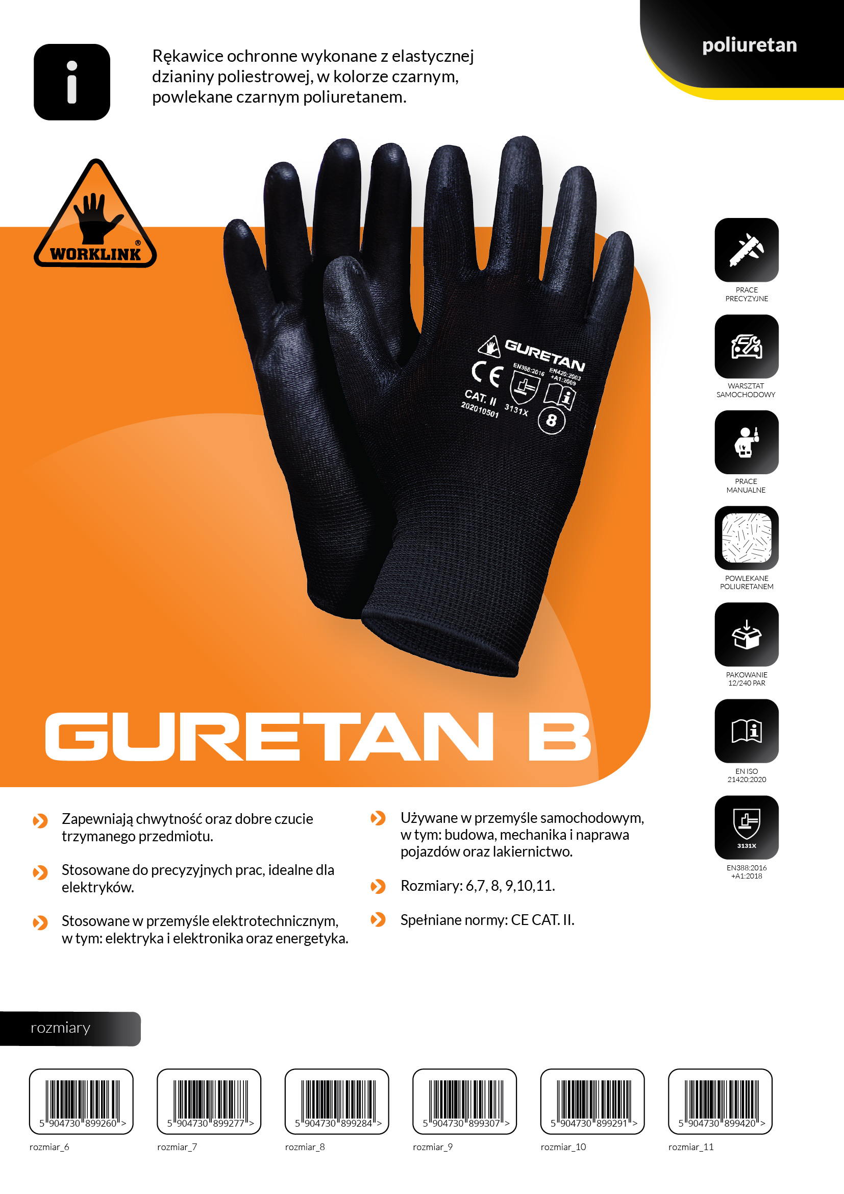 Rękawice ochronne wykonane z elastycznej, popielatej dzianiny poliestrowej (ścieg 13, 100% poliester), powleczone w części chwytnej poliuretanem, w tym samym kolorze.