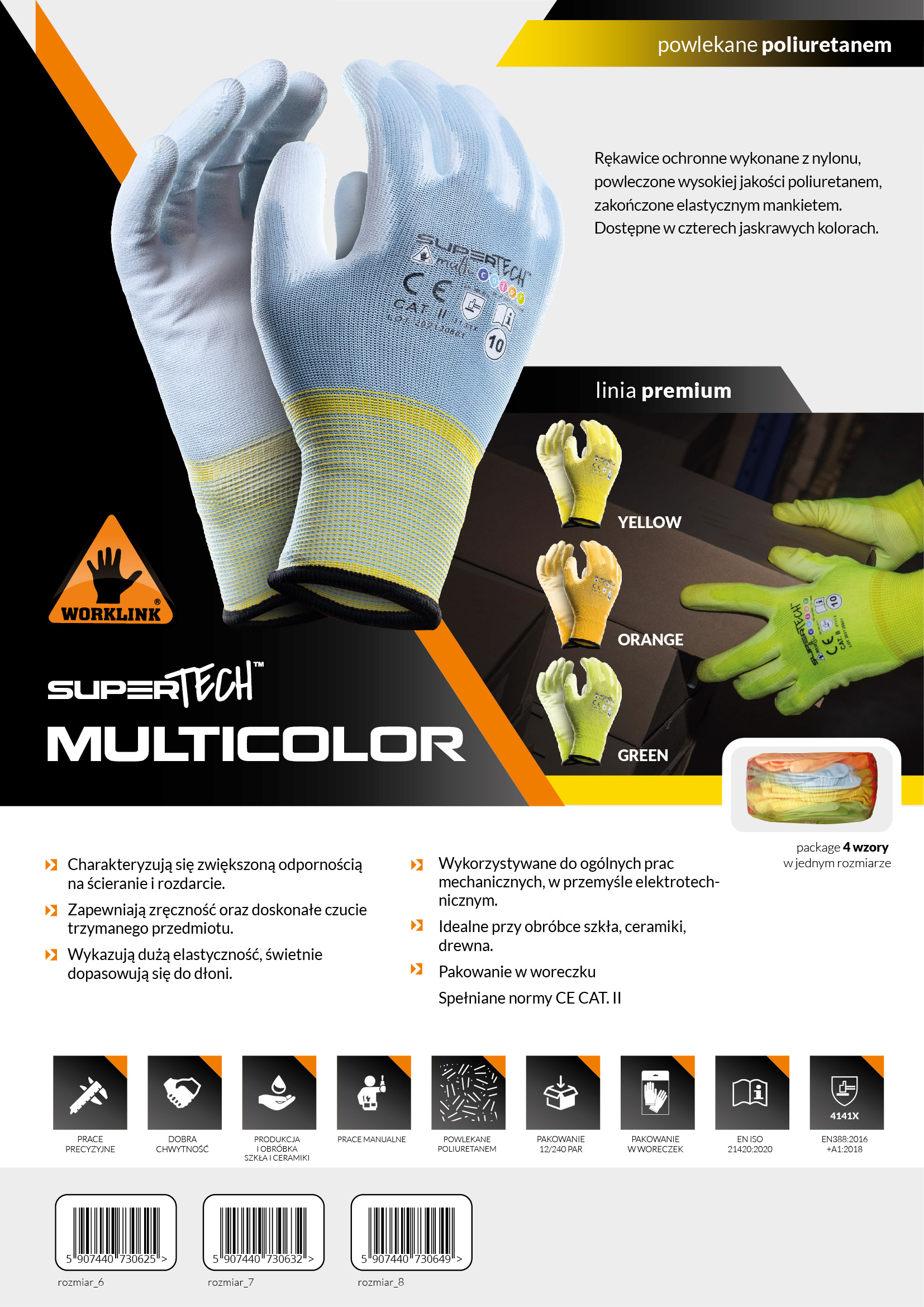 Rękawice ochronne wykonane z dzianiny nylonowej (13G, 100% nylon), powleczone wysokiej jakości poliuretanem, zakończone elastycznym mankietem. Dostępne w czterech jaskrawych kolorach.