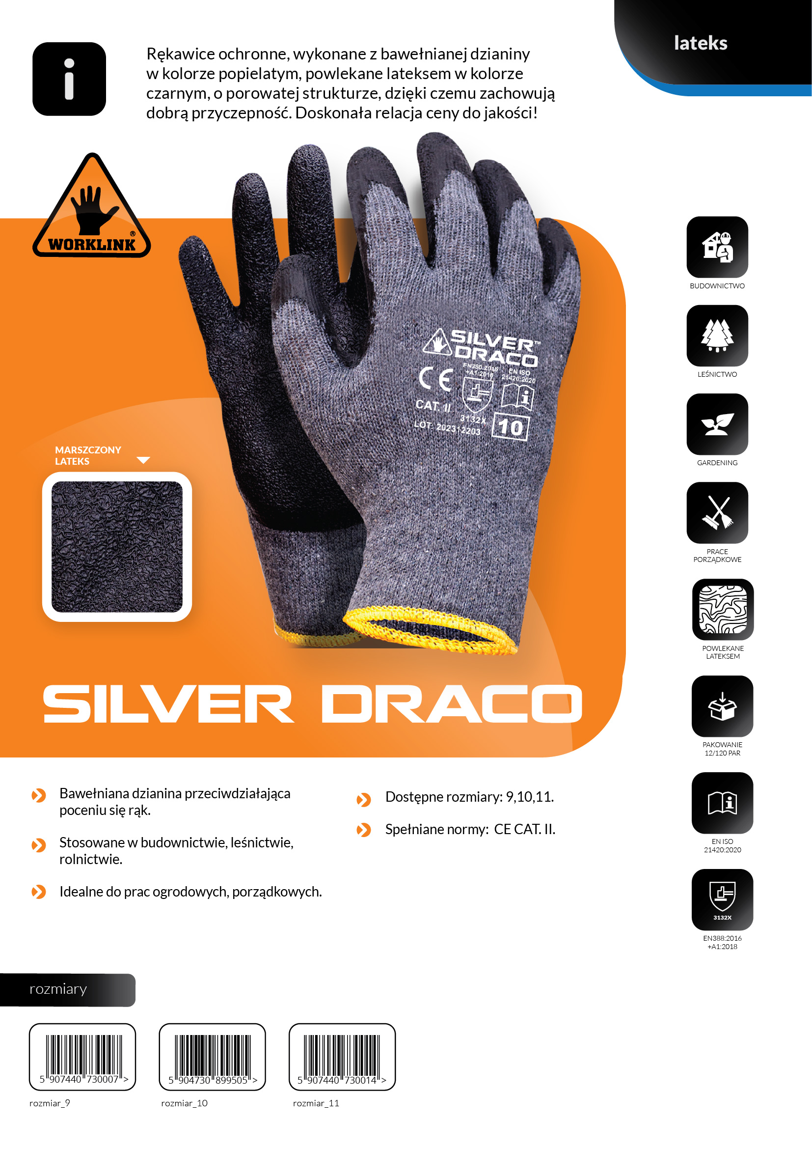 Dziane rękawice ochronne, powlekane lateksem w kolorze czarnym, o porowatej strukturze, dzięki czemu zachowują dobrą przyczepność. Doskonała relacja ceny do jakości!