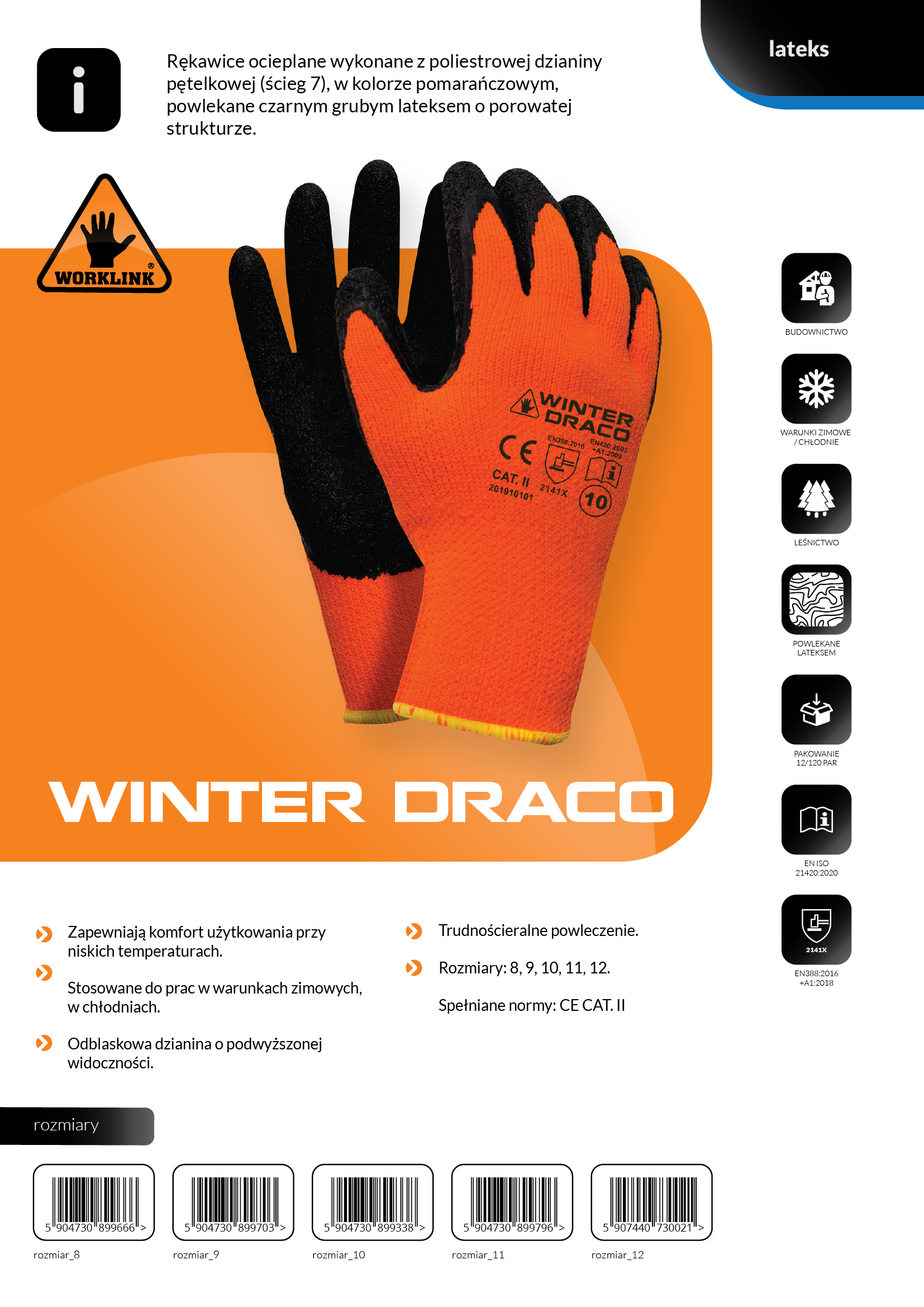 Rękawice ochronne, ocieplane. Rękawice zostały wykonane z poliestrowej dzianiny pętelkowej (ścieg 7), zapewniającej komfort użytkowania oraz utrzymującej ciepło dłoni. Rękawice zostały powleczone wytrzymałym lateksem o porowatej strukturze, dzięki czemu zachowują świetną przyczepność, przy czym nie tracą swojej elastyczności. Trudnościeralne i odporne na zużycie. Idealne do prac w niskiej temperaturze zewnętrznej.